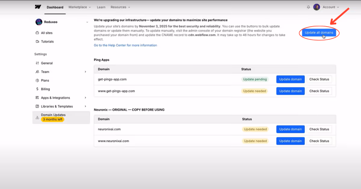 The quickest and easiest method is to let Webflow handle the updates for you automatically. This is the best option for most users, and it takes about 10 minutes. To make it as simple as possible, we can update all domains with a click. You'll just need to access your DNS provider account for each domain.