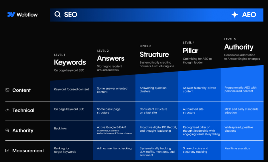 Webflow's AEO Maturity Model provides a framework broken out by four different categories, each containing five different levels to maturity.