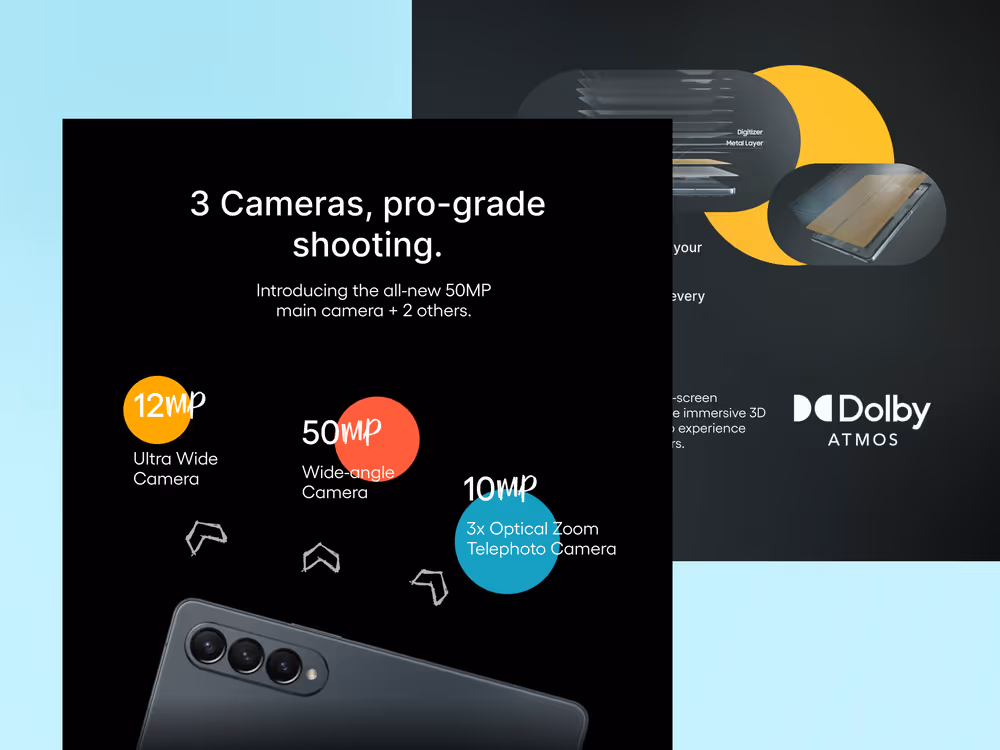 We elevated Samsung's concept website design by combining a bold dark aesthetic with vibrant accent colors, dynamic hand-drawn arrow elements, layered overlapping slide compositions, and expressive typography to create a more energetic and visually engaging user experience.