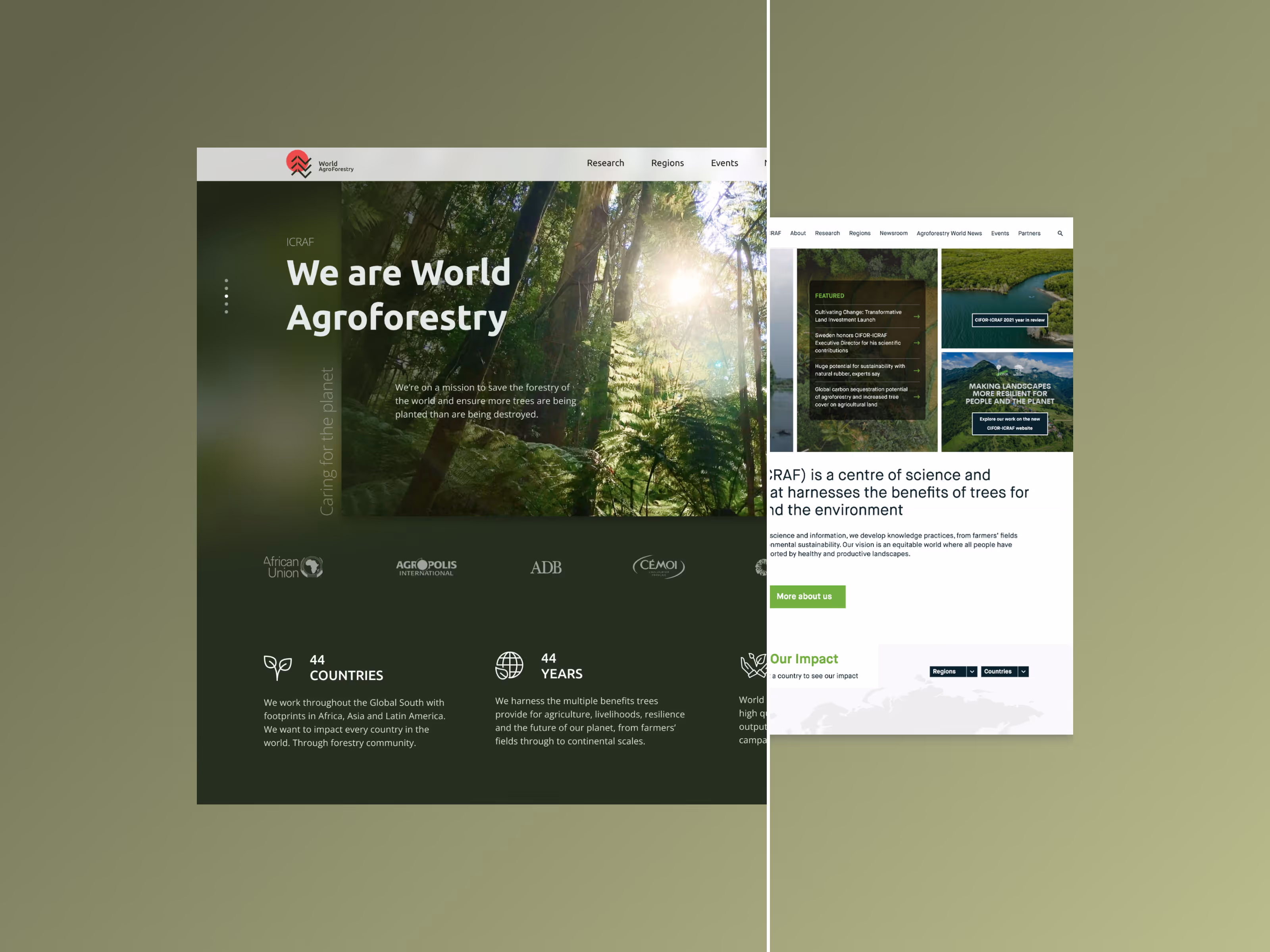 We created a concept design for World Agroforestry featuring a dark green identity, cleaner typography, and an interactive global map.