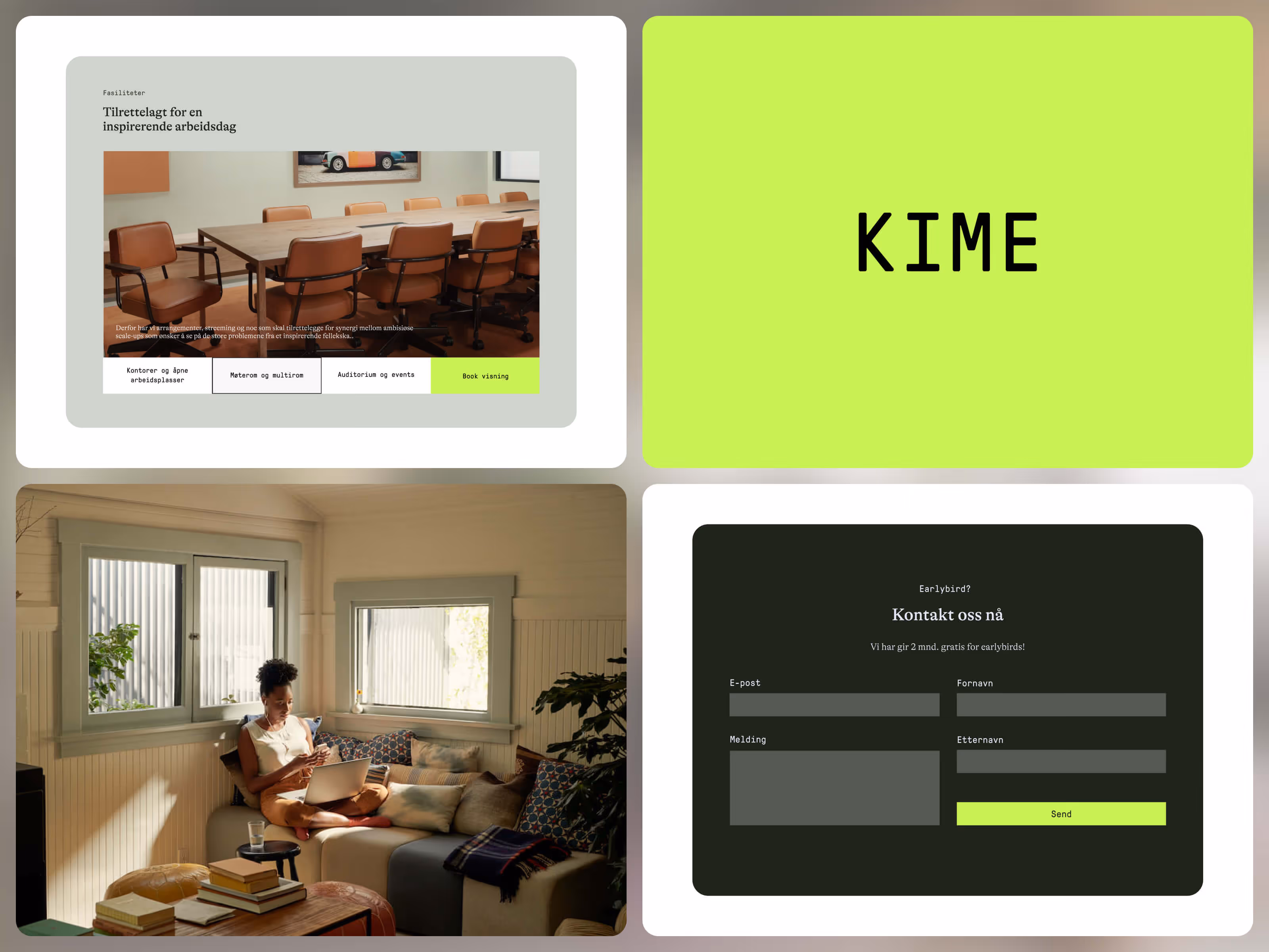 Lime green accents, clean typography, and a modular grid that lets renovated interiors prove the space is worth the price tag.